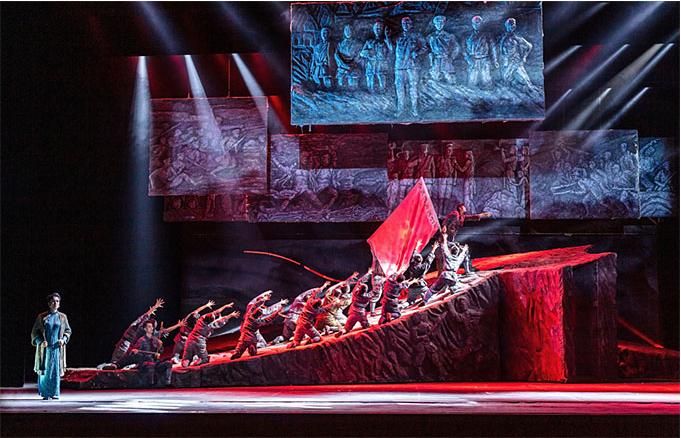 在舞蹈语言的设计上,编导融入当代元素,使观众不但感受到审美的亲切与现代感,而且还自然地进入回望历史的情境,对其思想内涵的理解更为准确。该剧的道具使用和调度也颇为大气,令人印象深刻。一组斜坡状的大型舞台道具不但由群众演员直接移动而实现即时的场景调度,还可使演员上下和左右而行,最终组合成巨大的中国共产党党徽,辅助完成了人民英灵和英雄的形象塑造。