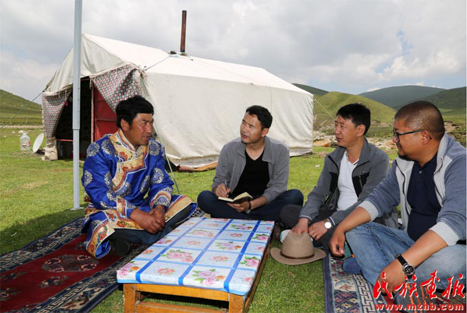 土旦(左)入户向牧民宣传草原法律法规和国家相关草原保护政策(黄若天 摄影)