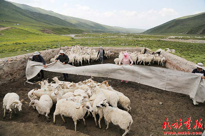 为响应退牧还草政策,海晏县哈勒景村的蒙古族牧民改变过去逐水草而居的生活,通过禁牧、以草定畜等措施改变草原生态。海云一家将羊群驱赶到一起为羊接种疫苗(陈涛 摄影)