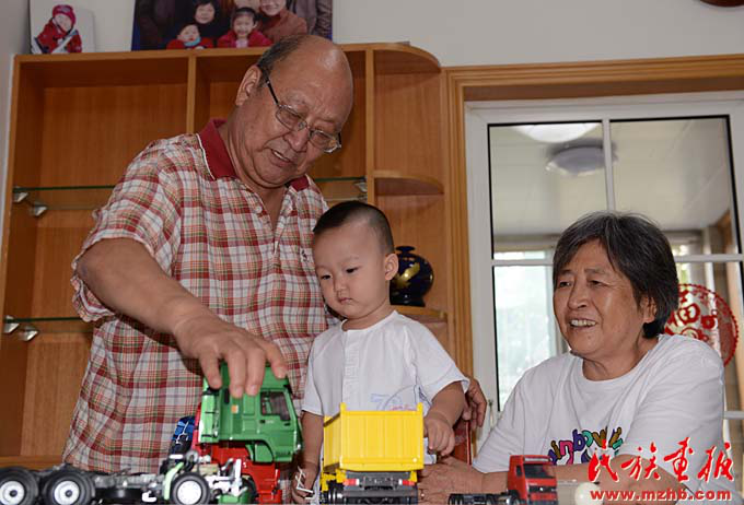 毕大宁与老伴陪小孙子玩车模,这是他们最开心的事(陈涛 摄影)