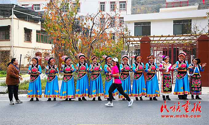 运动员们在奔跑中感受热热闹闹的羌历年,体验节奏明快的沙朗舞,近距离接触古朴厚重的羌族文化。