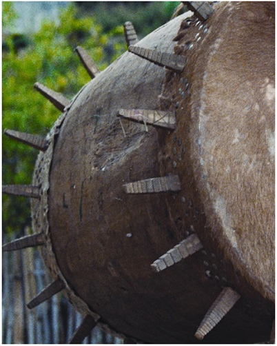 基诺族木质皮鼓的黄牛皮鼓面和太阳符