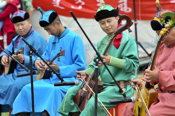 乌兰牧骑队员为牧民演奏《走马》 2017年5月26日 胡虎虎摄