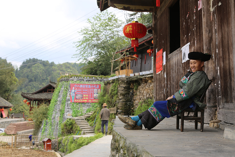 石拔三大妈的家位于村口,老人正在院子里晒太阳。这里的苗族习俗保持得很好,村民日常生活中大多是苗族传统打扮。大妈头裹黑帕头、穿一件绿色绣花苗装,利落得很。见来了客人,她赶紧把我往屋里让。