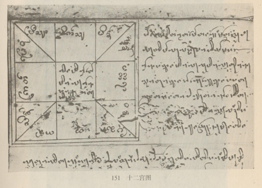 傣哪文天文著作中保存的傣绷文黄道十二宫图。图分13格,周围12格写傣绷文十二宫名,以上中格为起点,往左其顺序为白羊宫、金牛宫、双子宫、巨蟹宫、狮子宫、室女宫、天秤宫、天蝎宫,人马宫、摩羯宫,至双鱼宫与白羊宫衔接。中格及图外说明皆傣哪文。为罕见的两种傣文合壁的天文学资料。原件存民族文化宫。