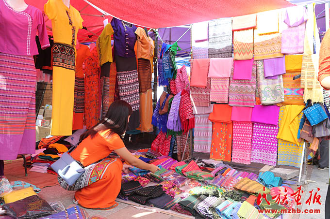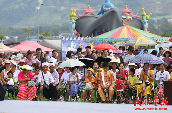 庆典活动上人潮涌动,氛围隆重。位于文化广场的演出中心区,傣族情歌对唱、孔雀舞表演、傣拳武术表演、傣剧等节目轮番上台。在舞台四周,一座座简易搭建的摊位前,卖有傣族服饰、货品、傣文书籍等。街道两旁的小吃一条街,摆有竹筒粑粑、撒撇、楂子、地瓜等特色美食。