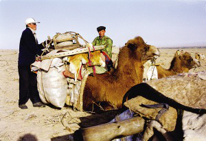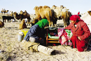每户人家的家就在那三四头骆驼的背上,骆驼的先后排列也是有讲究的。一般第一峰骆驼负责运被褥,妇女和小孩也坐第一峰骆驼。后面的骆驼则运衣服、日用品、食物、毡房的羊毛毡和毡房骨架。家里的男人们则骑着马,赶着大群的牛羊紧跟在后面。平时来往较少的牧民们因为转场,有了欢聚的机会。每天下午,牧民们就开始在路上安营扎寨,男人们开始从驼背上卸下毡房,在路边搭建临时简易毡房;女人们生火煮饭,孩子们成群地奔跑嬉闹,每家的牧羊狗或打架或形影不离。缓缓的炊烟在金色的黄昏中飘散,男人们开始围在篝火旁喝酒唱歌,火光映红每一张黝黑的脸庞,悠远的歌声在空旷的夜空飘荡。