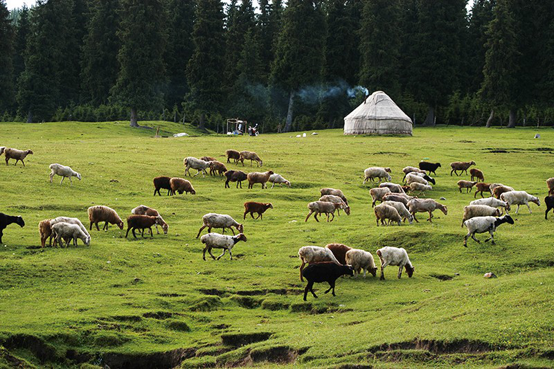 每年5月,牧民们赶着牛羊进入牧场。牧场离村庄或远或近,近的一两天就可到达,远的则要走十几天。上路的那天,牧民们将牛羊归拢到一起,沿山道缓缓行进。不一会儿,灰尘便被牛羊踩起,在山谷中一团团弥漫,使气氛一下子变得热闹起来。