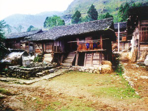 笔者看到的干栏式木楼和吊脚楼在使用的功能上相差无几,上层住人待客,楼下四壁用木板围挡,圈养畜禽,存放烧柴、农具和秋收临时堆放的粮食。猪圈靠里侧依柱围栏,其它空闲的地方打扫得干干净净,有的将织布机放在楼下明亮的地方。住房一般5间,两头两间是偏厦,中间3间是宽敞的堂屋,一头设火塘、土灶,为烤火、煮饭之处;另一头的中柱供临时设席敬神之用,也有的在板墙上设佛龛神位,供奉祖先;卧室依房柱用木板灵活隔间。大门有的开在房山墙一侧,也有开在中间的,皆登石阶、板梯而上。吊脚楼一栋挨着一栋,小巷道曲折狭窄,只容牵牛和顺向挑担通过。