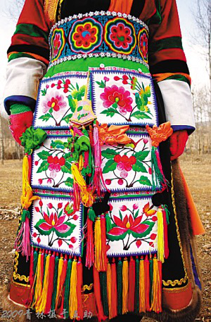 土族已婚妇女头戴“扭达”(头饰),身穿五色花袖衫,外套蓝、黑色坎肩,勒花腰带或褐带,穿绯红裙子,着绣花长腰布鞋;未婚姑娘则不戴“扭达”,不穿绯红裙子,头发不挽髻,只梳两条小辫子,中间梳大辫子,三条辫子合辫成一条,用红头绳扎紧,上系两枝小海螺;老年妇女只梳两条辫子,辫梢系在一起,垂在背后,只戴卷边毡帽,一般不戴“扭达”,不穿花袖衫,也不穿绯红裙子,腰带以黑布为多。
