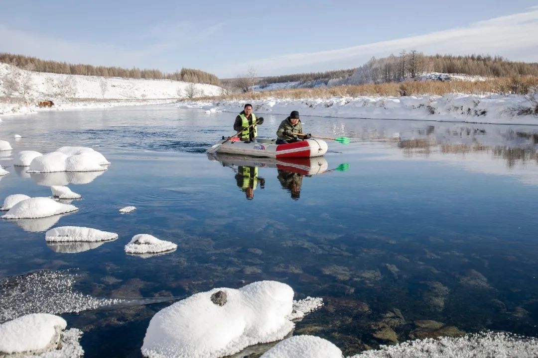 坐在船上,在随波逐流的漂流过程中欣赏冬日美景。不冻河的河水清澈异常,最深处将近2米,在皮划艇上看向水中,可以清晰地看到河底的石块,据说河水中还有各种鱼呢!