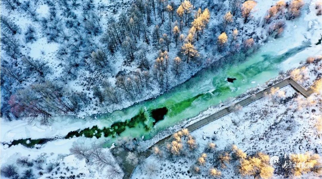 这条河叫哈拉哈河,是阿尔山不冻河的上游,进入冬季,内蒙古自治区大兴安岭林区气温降到零下二十几度,哈拉哈河大部分河面已经封冻,其中有三处河段依然在潺潺流动,每段长约300米,呈碧绿的颜色,远远望去,像是一块翡翠镶嵌在群山峻岭之中,宛如仙境,神奇梦幻。