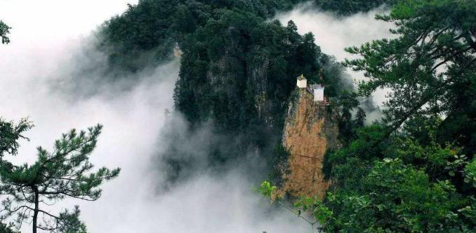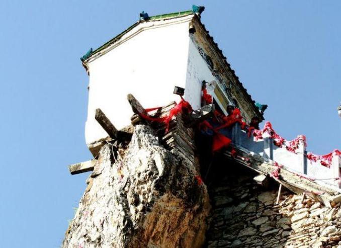 金顶上的观音殿,这座不足6平方米的小庙,周围地形十分险要,三面悬于数百米深渊,四根石柱插入岩缝,再用石条铺垫作为地基砌墙建庙,石条之间没有添加粘合剂,仅仅靠工匠相互叠加垒成,后方一个角完全悬空,远远望去,似乎一碰就会掉下百米悬崖。