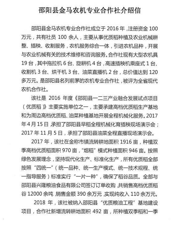 在农机专业合作社的帮助下,当地农业生产过程的机械化程度非常高。邵阳县金马农机专业合作社,位于邵阳县金称市镇石马村,主要提供组织农业机械耕整、插秧、收割服务,大大提高了当地的种植和生产效率。