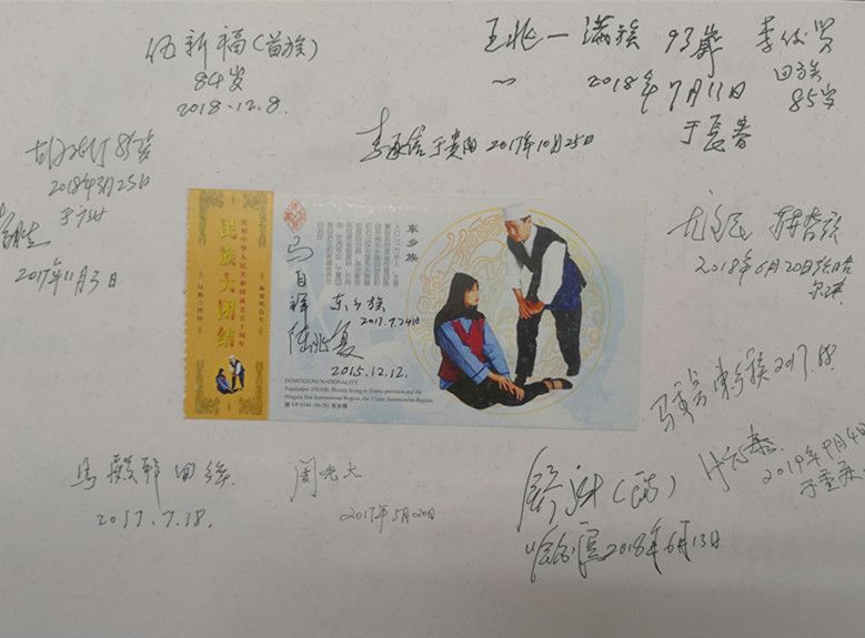 在采集口述影像录音资料的同时,项目组还收集了大量的珍贵历史照片以及相关文物。值得一提的是,他们设计了一种非常有特色的受访者签名簿,中间贴着绘有56个民族的音乐舞蹈图案的首日封或明信片,四周签上受访者的人名签名字、民族特征,有些还用民族文字书写,体现了中华各民族团结在一起的精神风貌。签名簿有厚厚的几大本,设计精美,承载着民族工作口述史资源采集的经历,具有丰富的文化内涵和博物馆收藏价值。