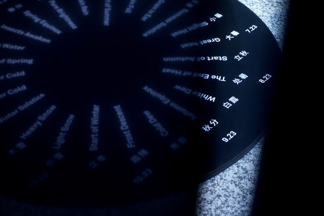 在展览第一部分,一个特殊装置呈现出了少数民族传统生活与自然节气相对应的服饰时光——24块由浅入深垂挂的蓝色染布,组成一个圆形空间,一套用365根蓝白布条连缀成裙的彝族女装放置其间;蓝色染布分别在一年二十四节气的当天染成,由于季节、水温等自然条件的不同,用同一种蓝色植物颜料印染的棉布,呈现出不同的色泽,这表明大自然对于织物所施加的不同影响;而由365根蓝白布条构成的裙子,则是由彝族姑娘每天缝制一根布条,花费一整年时间完成的……传统社会里,服饰何时做、何时何地穿,均有着对于岁时律历的恪守与契合;而服饰材料的获取、准备、制作,则因循春生、夏长、秋收、冬藏的时序,并与一个人、一个家庭、一个族群的历史记忆相交织。展览试图由此表明民族服饰对于宇宙时间的顺应与承载。
