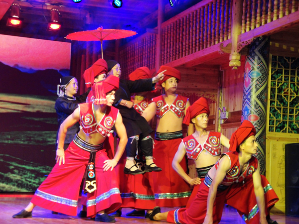来到镶有太阳花图案的演出场,观看皇都侗族文化村艺术团的精彩表演,则是另外一番享受,《敬酒歌》、《扯扯摸》、《踩簸箕》、《禾杆歌》、《闹茶》、《抢蛋》、《板凳情歌》、《筒地咯罗闹歌堂》等一组民族色彩十分浓厚的文化节目汇集了侗族传统文化的精华,轻歌曼舞,回肠荡气,于行云流水间透出一种阳刚之美。