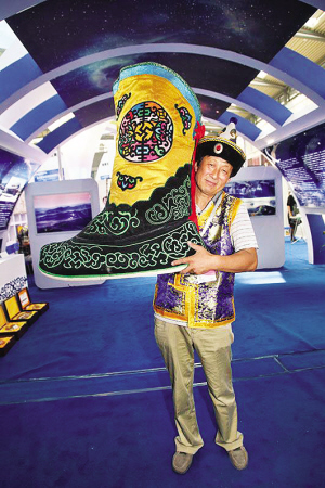 世界最大蒙古族绣靴亮相。靴长70厘米,高1米。 资料图片