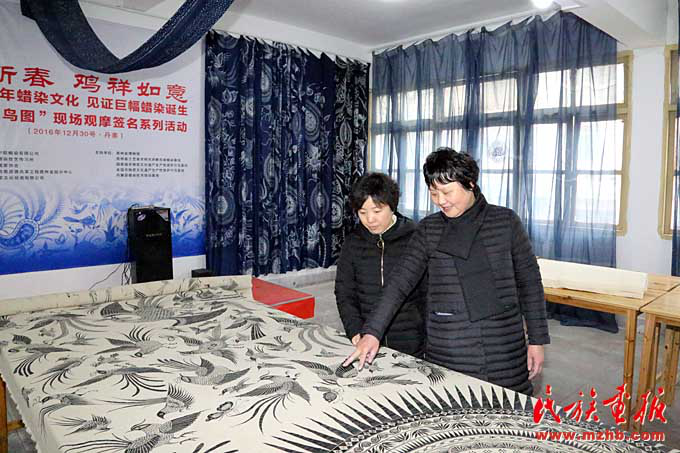 宁曼丽(右)和吴安丽在讨论长 10 米、宽 1.6 米的蜡画《百鸟图》