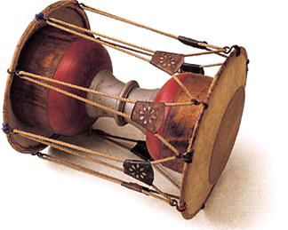 鼓框为木质,两面蒙皮,用绳索固定在木框两边。鼓链木质,通常在表演中负责敲击主要旋律的重拍,也有独奏的情况,声音有力。