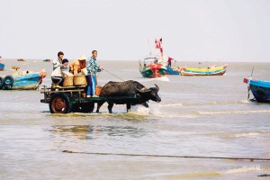 疍家渔民在海上用牛车运送渔获渔具(2013年摄)。