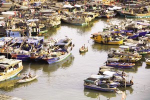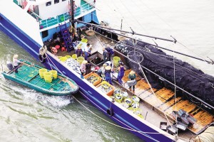 小快船靠上捕鱼归来的大渔船,收购、转运海鲜渔获(2014年摄)。