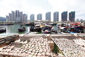 疍家人晾晒海鱼的对面耸立着一座座高楼(2007年摄)。