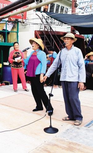 三亚疍歌传承人代表张发结(右)在渔船上演唱疍歌(2014年摄)。