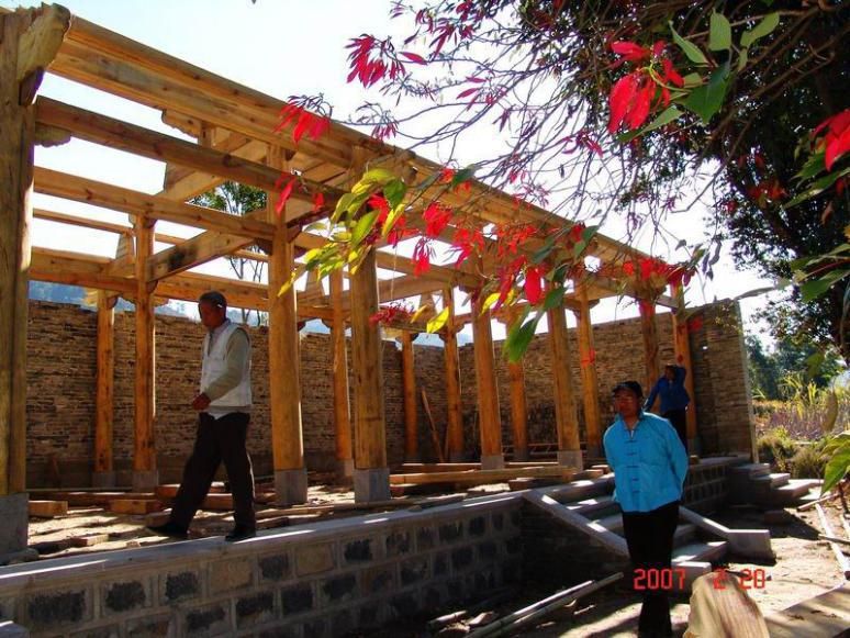 阿昌族建房传统用工多是相互帮忙,全村协作,只吃饭而不付酬。建房一般分为“选材备料”“看风水择房基”“动土奠基” “立柱成屋”等几大程序。