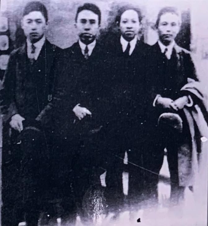 王若飞(右二)在法国勤工俭学期间和同学留影(许觊佳摄于贵阳市达德学校旧址)