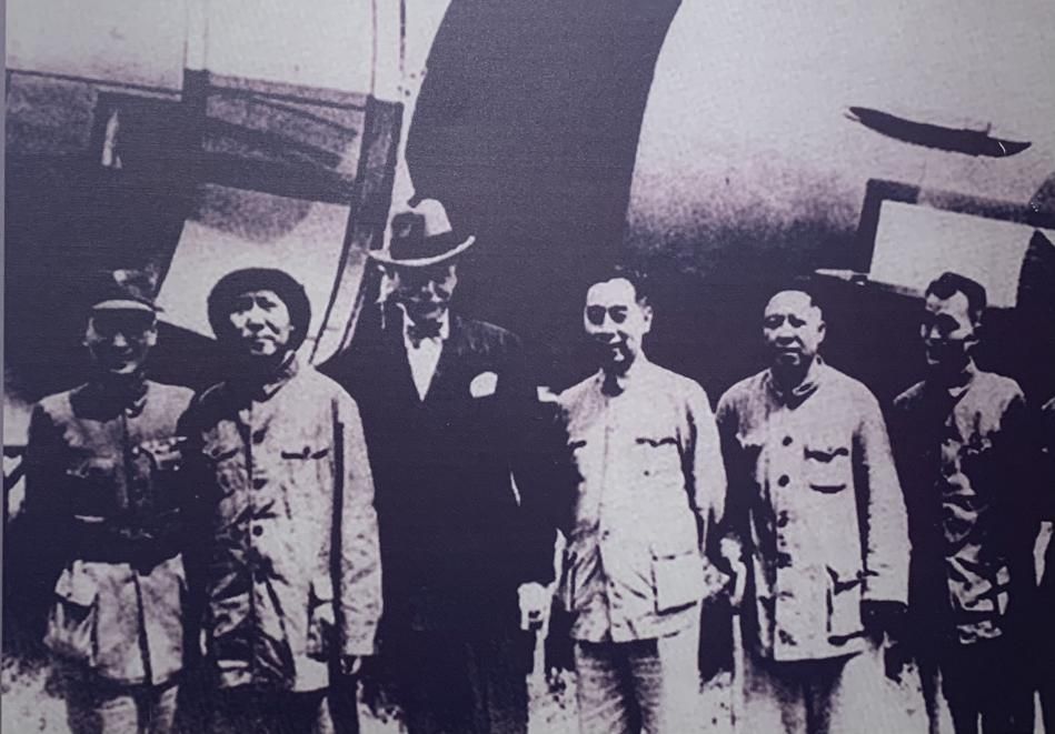1945年,中共代表团在赫尔利(美国驻中国大使)、张治中的陪同下临行前在延安机场合影,左起为张治中、毛泽东、赫尔利、周恩来、王若飞、胡乔木。(许觊佳摄于贵阳市达德学校旧址)