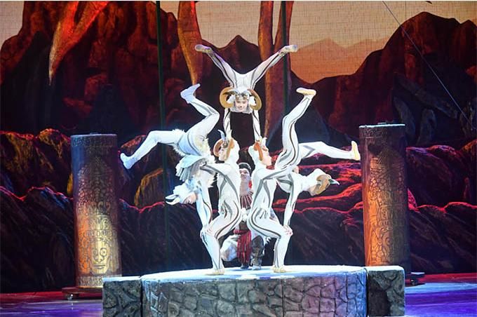 与以往传统的杂技表演不同,杂技剧《岩石上的太阳》要求演员既要完成高难度技术动作,还要完成剧中人物角色的戏剧表演。剧目中利用多种艺术手段加之高、难、险、惊的杂技节目,让观众在欣赏剧目的同时,能感受到一种强烈的文化氛围以及岩画带给人们不朽的记忆。