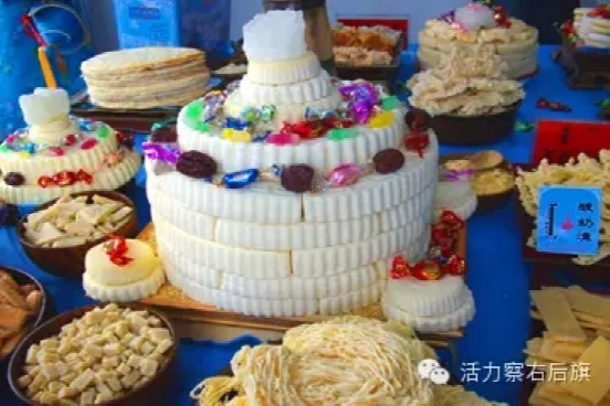 美味之一奶食:草原上的食品之首便是奶食。况且察哈尔人民在历史上为宫廷专供“奶食”的部落,所制作的奶食品品种丰富、名目繁多,做法千姿百态。奶食在蒙语中称"查干意德(ChagaanYidee)",俗称白色食品。奶食大体可分为液态奶食、固态奶食两类。液态奶食有鲜奶、淖劳日、爵亥、白油、酸油液、黄油、酸油渣、乳清、酸奶、熟酸奶、酸乳等。固态奶食有奶皮、奶豆腐、奶杂子、松葫芦、酸奶酪。奶食品中含有大量的氨基酸、蛋白质、油脂、微量元素,对人体机能有着不可缺少的营养成分,增强免疫力,有保健作用。奶食也被视为珍品,每逢拜年、祝寿、招待宾客、喜庆宴会等首先以品尝奶食、敬献奶酒为最美好的祝愿,这是一种神圣的礼节。