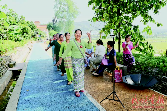 村中游客在录制抖音。