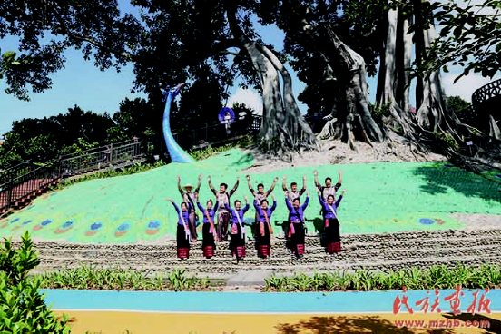 村民在孔雀雕塑下欢迎来到芒里村的游客。