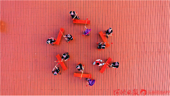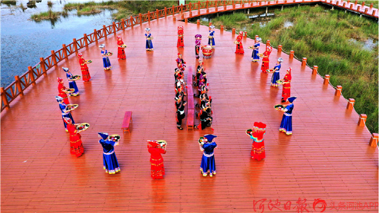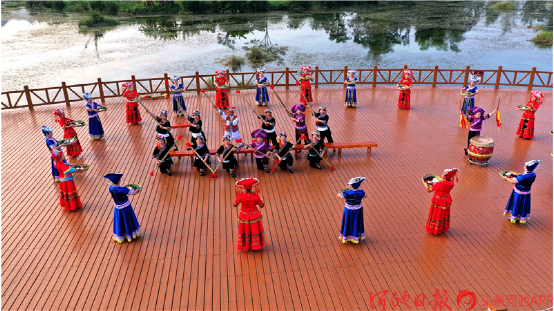 都安各族群众在澄江国家湿地公园表演打扁担。