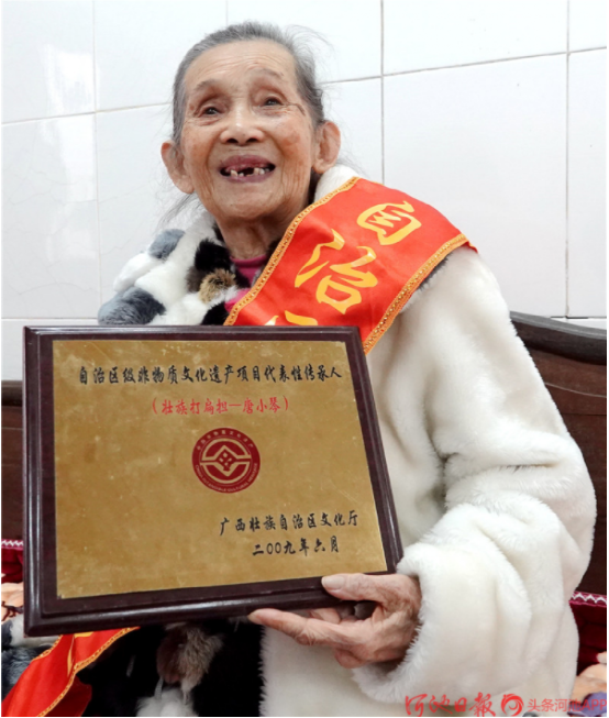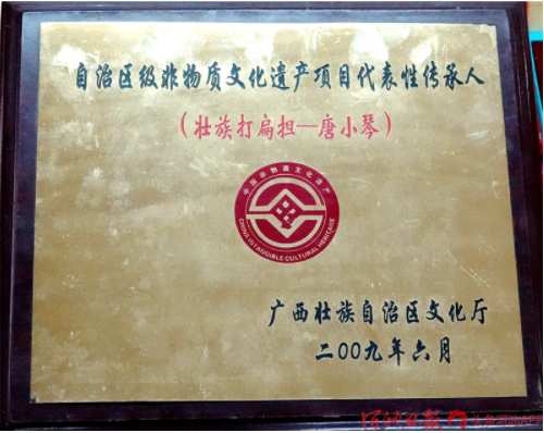 今年已经88岁高龄的“壮族打扁担”技艺传承人唐小琴,她从小即耳濡目染,跟村里老人、长者学习打扁担,后因打扁担需要指挥,又学习皮鼓打法。1961年4月,唐小琴从学校调入县文化馆任文化艺术辅导员,挖掘整理了《壮族打扁担》《板凳舞》《斑鸠舞》等一大批传统舞蹈,并多次在自治区、河池地区的比赛、调演上获奖。1986年退休后,仍然致力于《壮族打扁担》的传承工作,2004年,组建都安县老干康乐艺术团,带动安阳镇退休老人学习打扁担技艺。2009年,她被确认为自治区非物质文物遗产项目“壮族打扁担”代表性传承人。