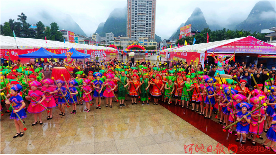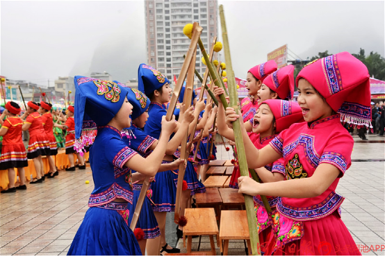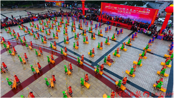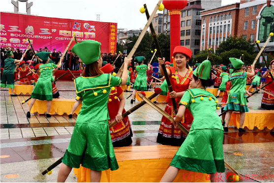 都安县500名群众欢聚一堂,打起扁担,喜迎“三月三”。