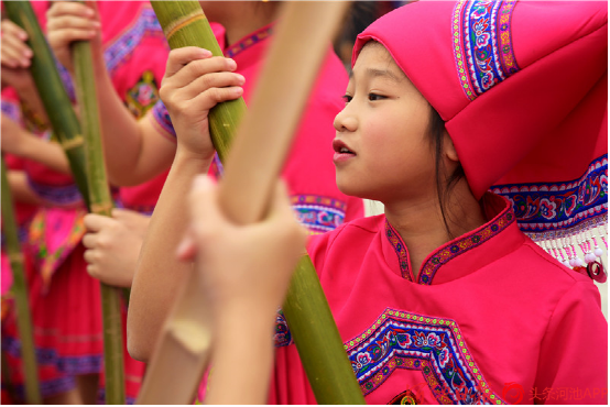 一群少年儿童欢聚在都安县文体广场打起扁担,喜迎三月三。