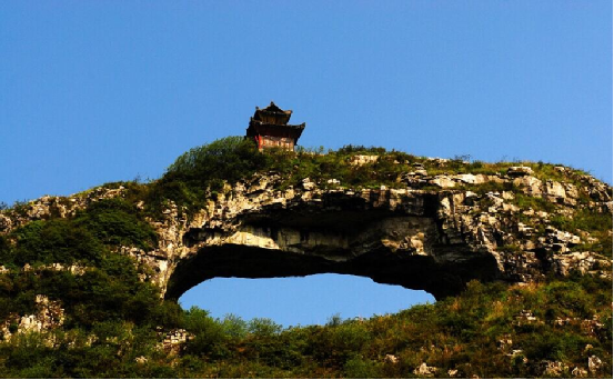仙桥山位于贵州瓮安县城西南5公里的仙桥村,雄峙于南北伸展的长岭之巅。山顶有一长方形穿洞,远望似一面中天明镜,又若仕女发髻上的一匹玉簪。民间传说,那高悬的“桥洞”,是神通广大的仙人张三丰发怒时一拳击穿的。站在“桥”下仰望“桥”顶,如巨粱横亘天际,青崖黛壁,辉映云天。天衣无缝的“桥身”和两边的“桥墩”,浑然一体,构成跨度约40米,宽20米,高约35米的“桥拱”。“桥拱”北面的“桥墩”脚有形状各异的石洞,曲径相通。洞壁有形似人脚印石凹,传说是仙人张三丰到此云游留下的足迹。