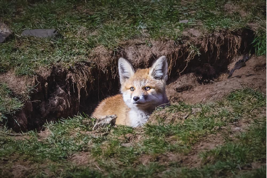 不知不觉中,太阳已经下山了。面对三只小家伙从警觉、惊喜、欢快到烦躁、无奈、焦虑的神态变化,我对记录了小赤狐一天的喜怒哀乐而高兴,又为小赤狐整整一天的忍饥挨饿而担忧,赶紧收拾摄影器材,撤离它们赖以生存的家园,还它们一个不被打扰的宁静……