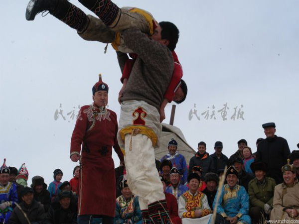 春节,蒙古人称为“白节”、“大年”,是蒙古人传统节日,时间在农历正月初一。居住在农村、城市、工矿区的蒙古族过春节的习俗同汉族差不多,但牧区有许多不同的特点。除夕之夜为“守岁”,合家老小席地坐在蒙古包中的矮桌周围,桌上摆着一盘盘香喷喷的肉类、奶食品,以及糖果、香烟、美酒等物,有的还要在矮桌上供一张大纸,纸上写着祖先的名字。午夜,开始饮酒吃年饭,或吃除夕饺子。按规矩团圆之宴要多吃多喝酒、肉,食器要摆满满一席。如吃不完也要剩得越多越好,象征新的一年里吃喝不尽、年年有余。家里的年轻人,要向长者敬“辞岁酒”。特别有意思的是全家共吃一块由酥油、糖、白面烙成的大圆饼,这叫吃新年饼,每人只吃一口,意思是全家永不分离,永久团圆,永远过甜甜蜜蜜的日子。除夕之夜要耍“嘎拉木”(玩羊骨头)、说书、唱歌、跳舞,通宵达旦,热闹一宿。过大年,按习惯还要拜年,大年三十晚上为辞旧岁礼, 初一早上为迎新年,晚辈给父母和老人叩头、敬酒、献哈达,祝老人们身体健康,晚年幸福!老人拥抱孩子们,并斟上一碗鲜奶,祝愿子女们幸福,像牛奶一样纯洁。大年初一早餐后,男女盛装,三五成群来到浩特(村镇),挨家串户给亲友拜年。客人进屋首先向长辈叩头拜年,祝愿老人身体健康,年丰人寿。按习惯由主人家的女婿向客人逐个敬酒,每敬必喝,或边喝边唱,边唱边舞。