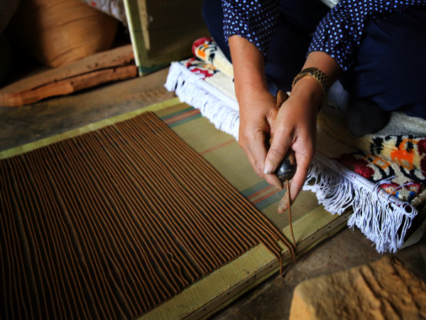 制作藏香的师傅以手工在专用的制香器具上将糊状备料制作成条状