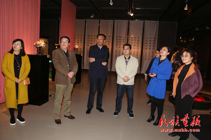 中国民族博物馆馆长顾群(左三)、中国妇女儿童博物馆副馆长刘华彬(右三)、中国民族博物馆副馆长张志文(左二)、中国民族博物馆副馆长郑茜(右一)等嘉宾参观展览