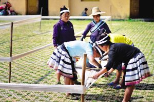 跑纱。白裤瑶的妇女们是天生的艺术家,女子要学会一整套的制作工艺。织布前,先把纱线理好绕成捆。大多是几个邻居互相帮忙才能完成。在跑纱过程中,也是妇女们交流技艺、聊家长里短的开心时刻。2014年5月拍摄。