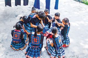 南丹县瑶族服饰代表性传承人黎凤珍在染坊免费教授前来学习的小学生。2018年拍摄。