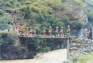 节日一大早,各家各户便到供奉药仙的树林中,环药仙的化身——一堆奇石或一棵古树歌舞、供祭。随后,人们各自相约成组,背篮荷锄,唱着《采药歌》,游山采药。若遇到要采、挖的植物,小组中年岁最长的人,会在其根部先挖一锄,然后停锄唱起《盘歌》:这是一兜草,它叫什么草?用它治啥病?药功好不好?随之,挖药者便从小到大,一人回唱一句作答:草名金钱草,采来加工变成宝,味苦、性凉用处多,肝病、尿阻少不了……之后,方采挖这棵药草。