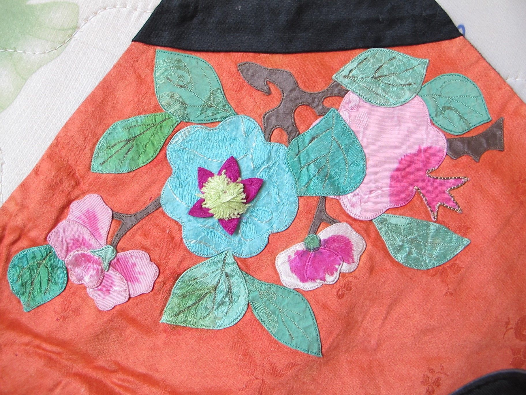 第四步是刺绣。机绣作品虽然操作简便,速度快,工作效率高,但由于不能随时调换粗细不同的机针或不同颜色的机线,图案比较简单,绣法也不能象手工绣那样灵活多变,所以东乡族妇女对能充分施展本领的手工绣情有独钟。