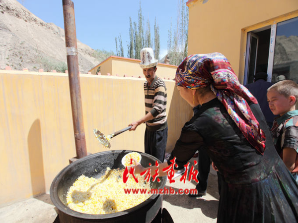 亲朋好友们在院子里支起大锅做抓饭、煮肉,招待宾客
