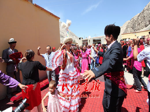 新郎、新娘和亲朋好友一起跳起柯尔克孜族舞蹈